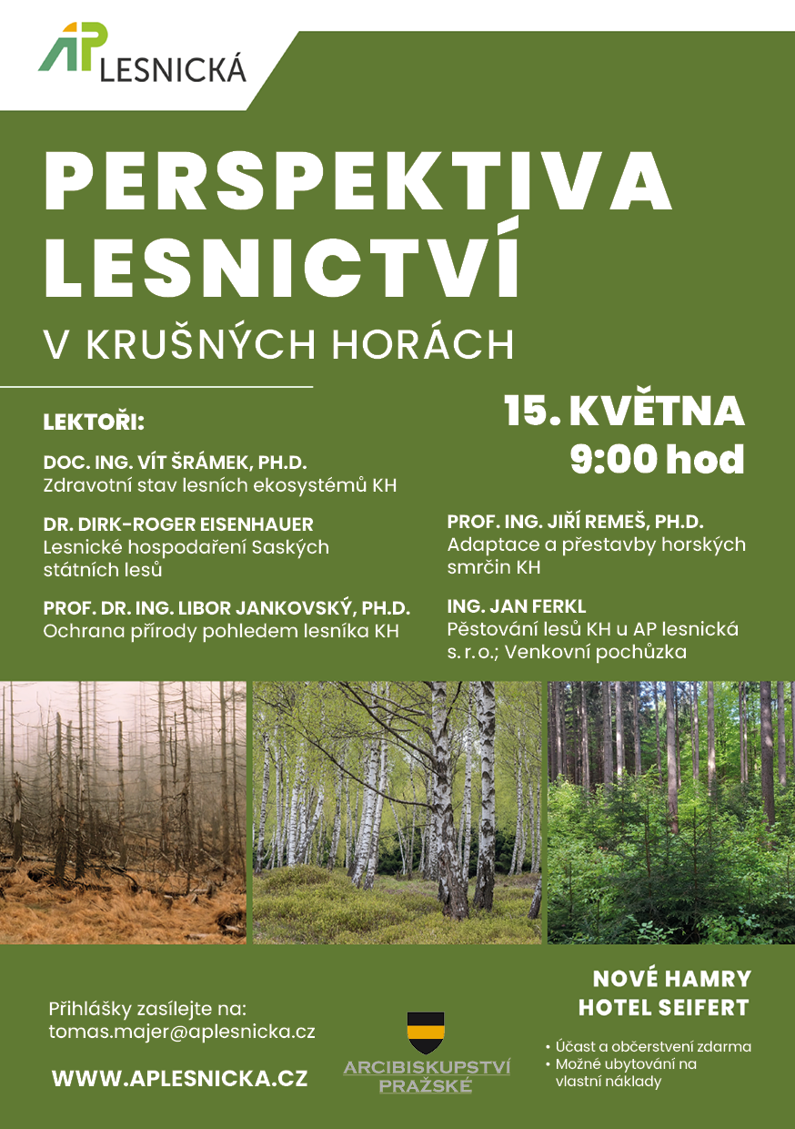 Arcibiskupství pražské a společnost AP lesnická s.r.o. Vás srdečně zvou ve čtvrtek 15. května od 9:00 do hotelu Seifert do Nových Hamrů na odborný seminář věnovaný současným výzvám a budoucnosti lesnictví v Krušných horách s názvem Perspektiva lesnictví v Krušných horách.