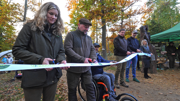 Akci zahájil generální ředitel Lesů ČR Dalibor Šafařík přestřižením pásky k otevření nového úseku bezbariérové naučné stezky v arboretu Vysocké u Hradce Králové. Foto: Lesy ČR