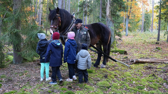 U stanoviště s ukázkou lesnických činností byly prezentovány současné i historické nástroje a ochranné pomůcky pro těžbu, manipulaci i měření dříví. Největší úspěch nejen u těch nejmladších sklidilo přibližování dřeva koněm. Foto: red.