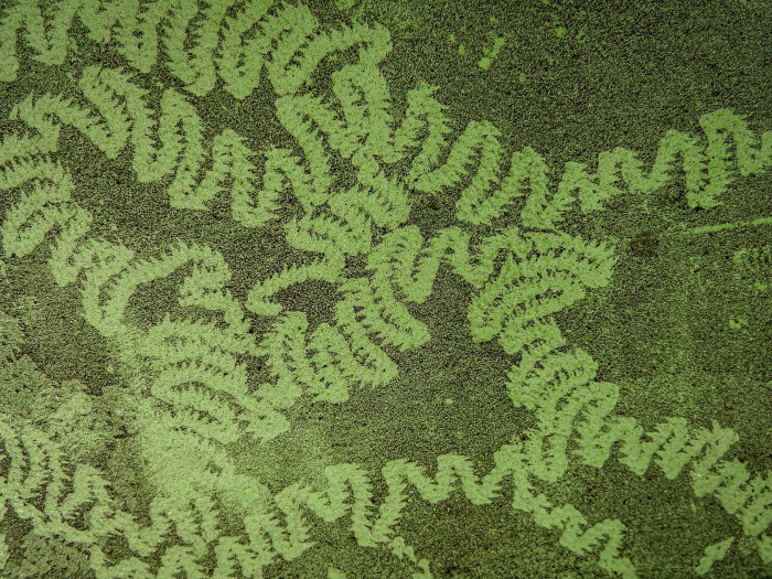 Stopy po „pastvě“ hlemýžďů na kontejneru tříděného odpadu. Svými ústy opatřenými radulou – zvláštním orgánem určeným ke strouhání - spásají tito hlemýždi porosty zelených řas na různých površích, v přírodě například na skalách, površích listů nebo na stromové kůře. Když se hlemýžď „pase“, pohybuje přední částí těla ze strany na stranu, čímž vznikají klikaté vzory viditelné na fotografii. V detailu jsou patrná i jednotlivá „hryznutí“ radulou.