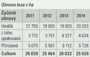 Plocha obnovených lesních porostů oproti předchozímu roku nepatrně poklesla na 25 929 ha, nicméně ve srovnání s předchozími roky je tato plocha srovnatelná a odpovídá celkovému objemu provedených těžeb v předchozích letech. Výše přirozené obnovy činí 5 726 ha, a přestože ve srovnání s rokem 2013 vykazuje mírný pokles o 386 ha, je patrné, že její plocha v posledních několika letech vykazuje vyrovnaný trend.