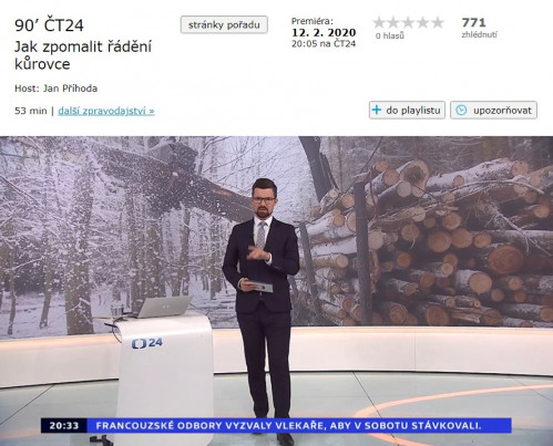 Tématu se věnoval pořad 90' ČT24 12. 2. 2020 (hosté: Jan Příhoda, předseda, Czech Forest think tank Patrik Mlynář, náměstek pro sekci lesního hospodářství, Ministerstvo zemědělství Marek Turčáni, prorektor pro strategii, Česká zemědělská univerzita v Praze). Můžete ho zhlédnout zde.