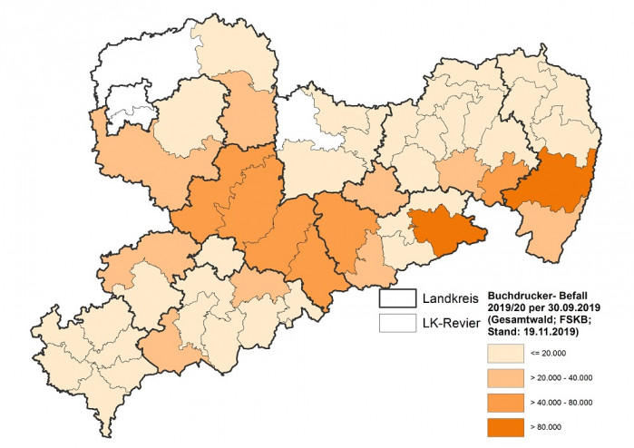 - Jaké jsou poslední odhady škod kůrovcovou kalamitou v Sasku za rok 2019 a které oblasti jsou poškozeny nejvíce?