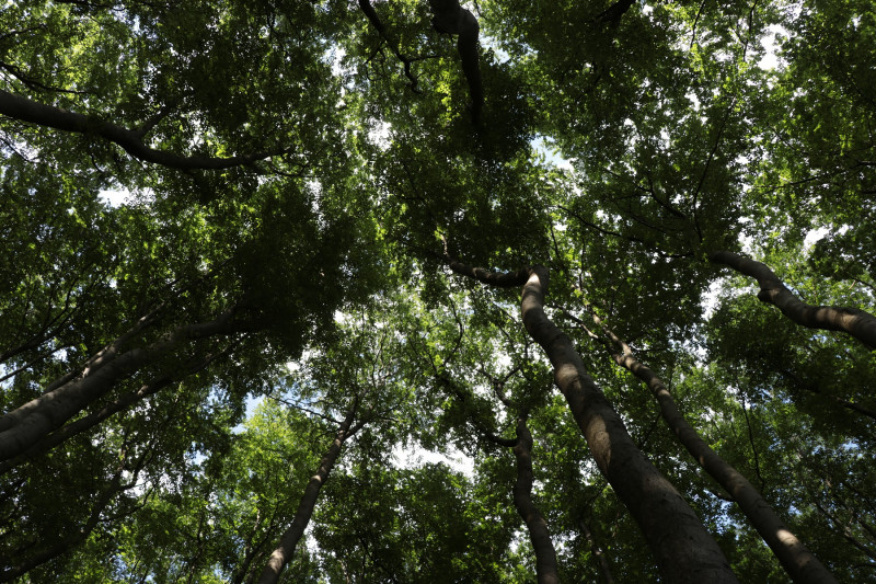 Pohled dovnitř a na koruny vysoce produkčního porostu buku, revír Behlendorfu.
