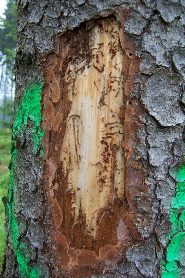 Loupající se kůra stromu napadeného lýkožroutem smrkovým.