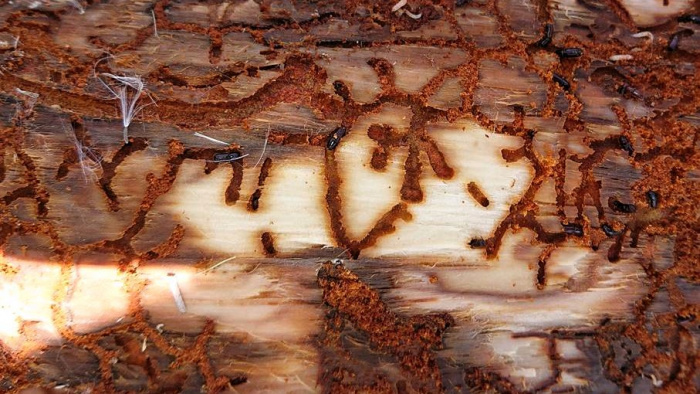 Požerek kůrovce Orthotomicus longicollis, který napadá borovice na celém území ČR zvláště v posledních několika letech. V minulosti nebyl příliš běžný. Foto: Petr Doležal, BC AV ČR