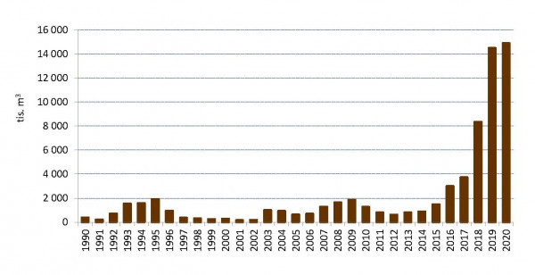 V roce 2020 bylo evidováno téměř 14,9 mil. m3 vytěženého smrkového kůrovcového dříví, což představuje opětovné zvýšení „rekordních“ hodnot zaznamenávaných v posledních letech. Oproti roku předchozímu, kdy bylo evidováno 14,5 mil. m3 kůrovcového dříví, se jedná o nárůst ve výši 0,4 mil. m3. V roce 2018 bylo evidováno 8,4 mil. m3 (2017 – 3,7 mil. m3, 2016 – 3 mil. m3, 2015 – 1,5 mil. m3).![]()