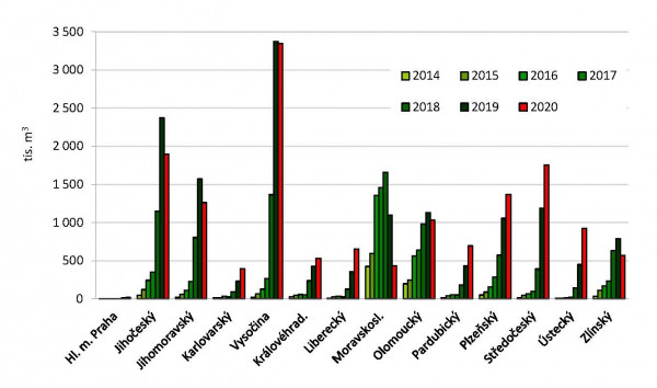 V rámci srovnání jednotlivých krajů byla v roce 2020 situace nejdramatičtější v kraji Vysočina (evidováno cca 3,3 mil. m3), v Jihočeském (1,9 mil. m3) a Středočeském kraji (1,8 mil. m3). Více než 1 mil. m3 vytěženého kůrovcového dříví bylo evidováno také v krajích Plzeňském (1,4 mil. m3), Jihomoravském (1,3 mil. m3) a Olomouckém (cca 1,0 mil. m3).![]()