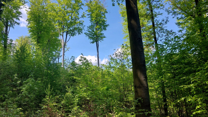 Demonstrační objekt zvaný Krušná hora, (Křivoklátsko, květen 2025). Konečná fáze přirozené obnovy buku s ponecháním stojících stromů do jejich rozpadu.