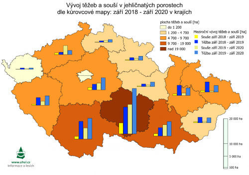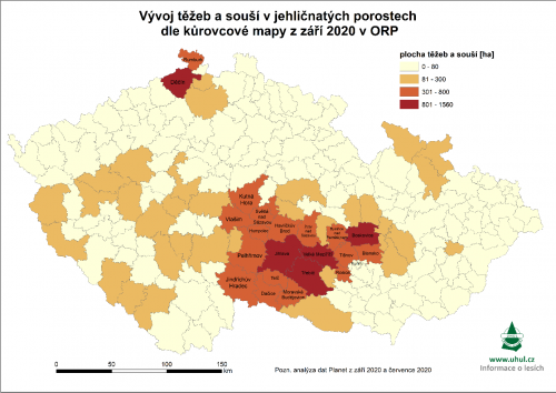 Dle celkové výměry těžeb a souší v převážně jehličnatých porostech jsou za aktuálně sledované období nejvíce zasaženými ORP především Děčín (cca 1 550 ha) a Jihlava (cca 1 550 ha), dále pak Boskovice, Třebíč, Velké Meziříčí, Bystřice nad Pernštejnem, Pelhřimov, Havlíčkův Brod a další. Proti předchozímu období nastala tedy změna a nejvíce zasaženým ORP (dle součtu detekovaných těžeb a souší) se stal spolu s ORP Jihlava i ORP Děčín. Pro dané území ORP Děčín má dominantní vliv vývoj situace NP České Švýcarsko, kde lze na ukázkové animaci vizualizovat vývoj v čase od září 2018 do září 2020. (viz obr. 1 - animace).