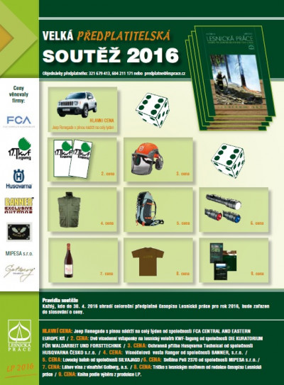 Předplatitelé Lesnické práce mají možnost - stejně jako v minulém roce - i letos vyhrát v předplatitelské soutěži zajímavé ceny - první cenou je zapůjčení Jeepu Renegade s plnou nádrží na jeden týden, dále se soutěží o vícedenní vstupenky na lesnický veletrh KWF-tagung, ochranné pracovní pomůcky, lesnické a myslivecké oblečení a vybavení, knihy a trika z našeho nakladatelství ad.