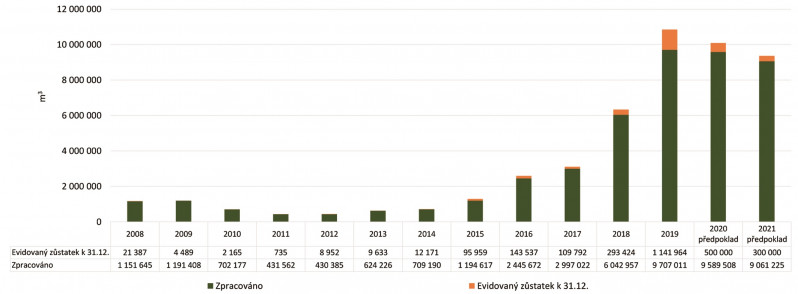 Vývoj zpracování kůrovcového dříví a zůstatků u Lesů ČR k 31. 12. daného roku