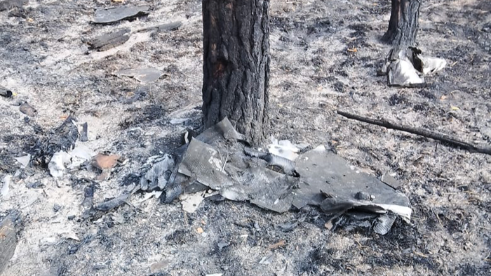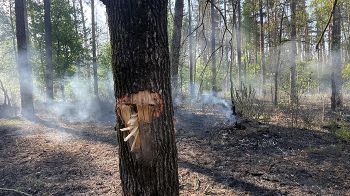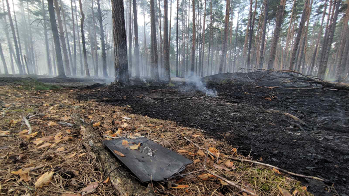 Porost zasažený lesním požárem způsobeným pádem ruského dronu v lesním revíru Dymer (Kyjevská oblast).