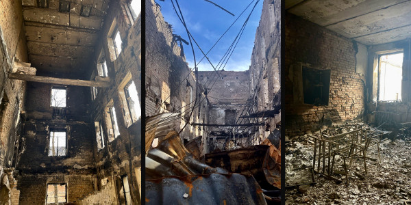 Vybombardovaná budova Ústavu státního lesního hospodářského plánování v Irpini.
