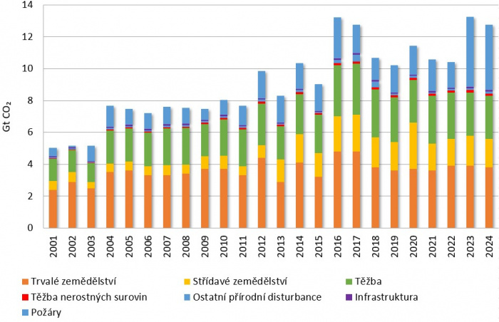 Globální emise spojené s lesy podle příčiny v letech 2001-2024. Zdroj: WRI