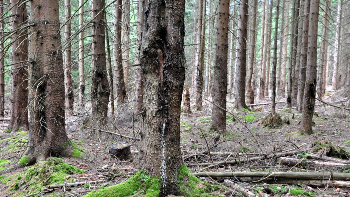 V mládí silně poškozené dnes již dospívající smrkové porosty, bazální části kmenů jsou znehodnocené hnilobou, stromy jsou náchylné ke zlomům, mechanická stabilita porostu je významně snížena. Foto: Jan Řezáč