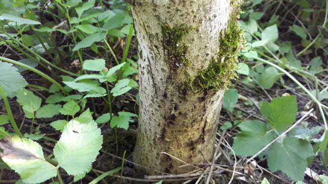 Spodní část kmene živého stromu s výletovými otvory kůrovce ořešákového.