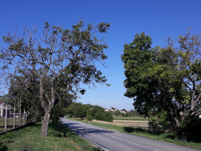 Ořešák královský u obce Blučina se silným prosycháním koruny.