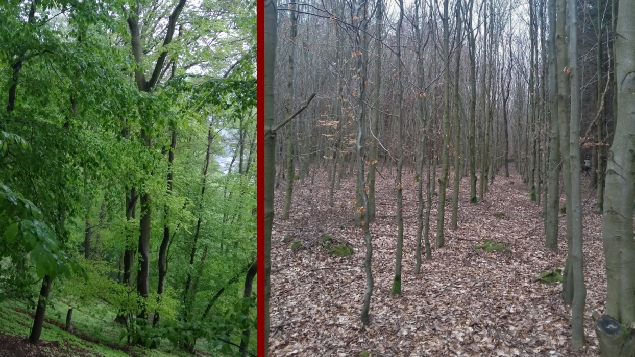 Vlevo – buk na výsušném stanovišti na Křivoklátsku ve svahu (vybraném pro projekt); vpravo – provenienční plocha buku založená z kvalitního osiva, resp. porostu kategorie A. Foto: Martin Fulín