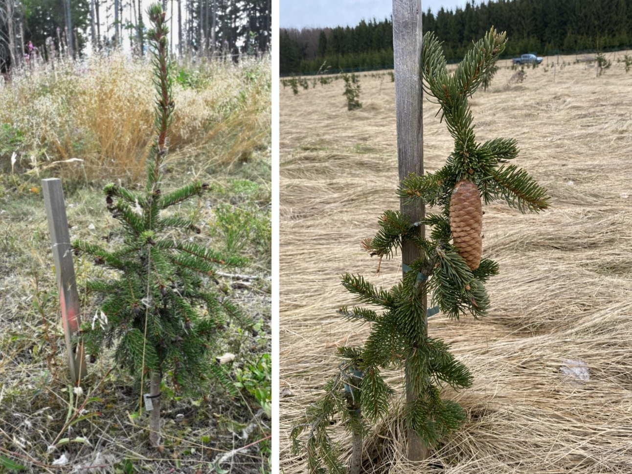 Vlevo – roubovanec rezistentního krušnohorského smrku v matečnici (směsi klonů) na lokalitě in situ pod správou ML Klášterec (autor Ing. Jaroslav Dostál, 2020); vpravo – plodící roubovanec v semenném sadu rezistentního krušnohorského na lokalitě in situ pod správou ML Chomutov. Foto: Radek Vernar