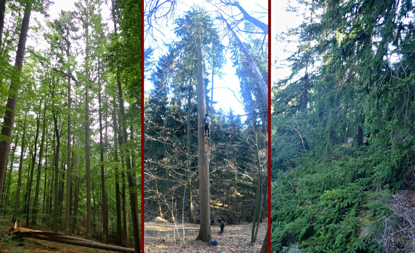 Vlevo – výběrové stromy smrku v oboře Květov u Orlíku spravované společností Orlík, s. r. o. Foto: Martin Fulín; uprostřed – odběr roubů smrku ztepilého v NP České Švýcarsko. Foto: Martin Fulín; vpravo – odběr roubů z hřížícího smrku na lokalitě Ledové sluje v NP Podyjí. Foto: Martin Fulín