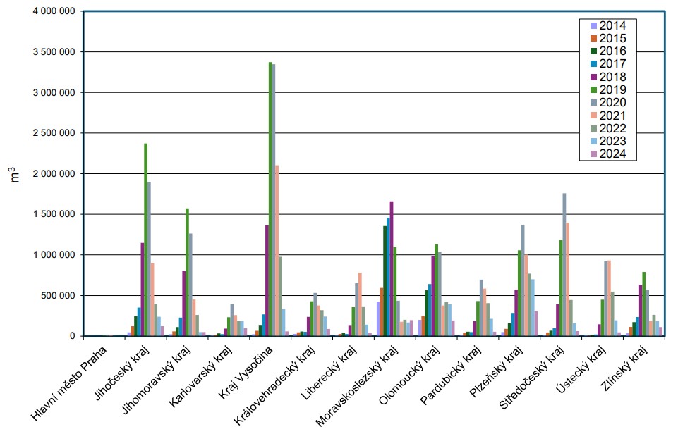 Podle krajů byly v roce 2024 nejvyšší evidované objemy vytěženého smrkového kůrovcového dříví vykázány v krajích Plzeňském (309 tis. m³; 2023: 700 tis. m³), Moravskoslezském (197 tis. m³; 2023: 167 tis. m³) a Olomouckém (193 tis. m³; 2023: 392 tis. m³). Více než 100 tis. m³ bylo dále evidováno v krajích Jihočeském (122 tis. m³; 2023: 238 tis. m³) a Zlínském (112 tis. m³; 2023: 183 tis. m³).