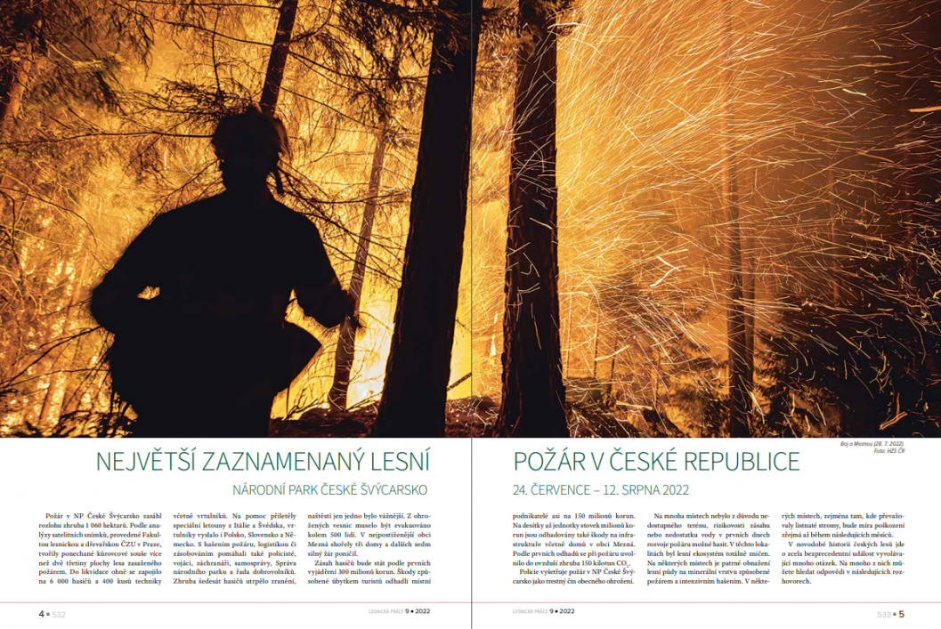 Redakce Lesnické práce se snažila v podzimním čísle časopisu co nejkomplexněji celou událost zmapovat. Přečíst si tak můžete rozhovory s ministryní životního prostředí, ředitelem NP České Švýcarsko, generálním ředitelem Hasičského záchranného sboru ČR, velitelem Sboru dobrovolných hasičů Hřensko, senátorem za Děčín, starostou obce Doubice přiléhající k NP České Švýcarsko i obyvatelem nejpostiženější obce Mezná. Jak na požár v národním parku, který je součástí kulturní krajiny, nahlížet, se zamýšlí odborníci z univerzit a vědeckých pracovišť. Anketa, v níž odpovídají odborníci na pěstování a ekologii lesa pak přináší představu o tom, co se může v parku dít z hlediska obnovy lesa. Téma doplňuje chronologický souhrn průběhu požáru a přehled lesních požárů v Evropě a ve světě v letošní sezoně.