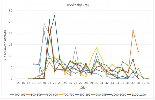 V Jihočeském kraji odpovídá situace prakticky celorepublikovému hodnocení. Vyplývá to z poměrně velkého počtu odběrných míst rozmístěných v osmi výškových intervalech. Třetí rojení bylo velmi intenzivní zejména v nadmořské výšce 500–599 m n. m., kde předčilo i obě předcházející rojení. Průměrné odchyty zde však byly relativně nízké, pohybovaly se nejčastěji kolem 200 zachycených jedinců, výjimečně bylo překročeno 500 jedinců, zcela ojediněle pak i více (do necelých 1 500 jedinců), a to v jarním rojení a překvapivě i ve třetím rojení.