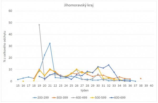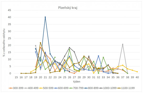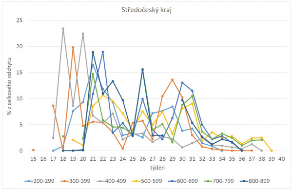 Středočeský kraj, kde bylo hodnoceno sedm výškových intervalů, opět do jisté míry odpovídá celorepublikovému hodnocení, se zaznamenaným třetím rojením v 37. a 38. týdnu. Průměrné odchyty zde byly relativně nízké, nejčastěji do výše 200 ks, avšak v intervalu 18. až 31. týdne dosahovaly až 1 000 zachycených jedinců.
