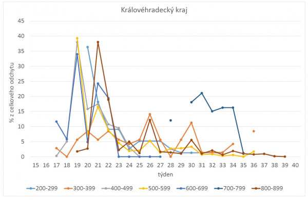 Královéhradecký kraj (sledování v sedmi výškových intervalech) byl v rámci sledování průběhu rojení lýkožrouta smrkového téměř typický. První rojení proběhlo v 19.–22. týdnu, i když ne vždy zde byl patrný posun nadmořských výšek (to může být ovlivněno např. expozicí). Sesterské přerojování bylo zaznamenáno ve 26. týdnu. Druhé rojení bylo zaznamenáno v 30. týdnu. Třetí rojení bylo evidováno pouze ve výškovém intervalu 300–399 m n. m., a to v 36. týdnu. V ostatních výškových intervalech se neprojevilo (ukončení odchytů v 39. týdnu). Zcela atypicky se projevily odchyty ve výškovém intervalu 700–799 m n. m., pro které se nesnažíme nalézt vysvětlení, bylo by příliš spekulativní.