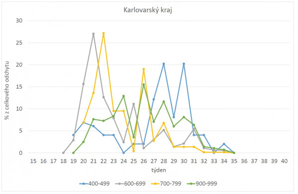 Karlovarský kraj se v letošním hodnocení projevil značně atypicky. Sledovány byly čtyři výškové intervaly. Je překvapivé, že v nejnižším výškovém intervalu (400–499 m n. m.) byl malý náznak prvního rojení mezi 19. a 21. týdnem, avšak vyšší odchyty byly zaznamenány mezi 28.–30. týdnem – mohlo jít o sesterské rojení intenzivnější než rojení vlastní. Vrchol prvního rojení ve výškovém intervalu 600–699 m n. m. byl ve 21. týdnu, v intervalu 700–799 m n. m. ve 22. týdnu. Pro tyto výškové intervaly se objevilo sesterské rojení ve 25. a 26. týdnu. Zajímavý je průběh rojení ve výškovém intervalu 900–999 m n. m., kde byl vrchol prvního rojení ve 24. týdnu, ovšem relativně vysoké odchyty byly zaznamenávány až do 31. týdne (s mírnými poklesy ob jeden týden). Druhé rojení zde nebylo prakticky zaznamenáno. Ukončení odchytů se uskutečnilo v 35. týdnu, takže nelze ani zjistit, zda proběhlo třetí rojení. Průměrné odchyty zde byly nízké, zpravidla ve výši 100–200 ks, pouze v jarním rojení dosáhly výjimečně až 500 zachycených jedinců. Nejvyšší odchyty byly překvapivě zaznamenány ve výškovém intervalu 700–799 m n. m., kde se mezi 20. až 28. týdnem pohybovaly v rozpětí 500 – 2 000 ks.