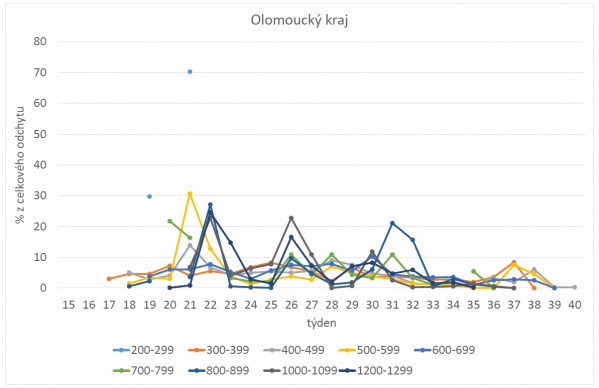 Olomoucký kraj paří mezi extrémní kraje s ohledem na výskyt lýkožrouta smrkového. Sledováno bylo devět výškových intervalů. První rojení proběhlo mezi 18. a 22. týdnem, s posunem s narůstající nadmořskou výškou, i když ne vždy zcela lineárním. Výrazné sesterské rojení bylo zaznamenáno ve 26. týdnu. Druhé rojení proběhlo v 30.–32. týdnu a třetí pak v 37.–38. týdnu. V dalších dvou týdnech byl zaznamenán pokles, sledování bylo ukončeno ve 40. týdnu. Většina průměrných odchytů se pohybovala v rozpětí 100 – 1 000 zachycených jedinců, ale často i do 2 000 jedinců, výše jen zcela ojediněle (maximum přes 4 000 ks). Zajímavý je průměrný odchyt v 37. týdnu ve výškovém intervalu 300–399 m n. m. ve výši téměř 2 000 ks.