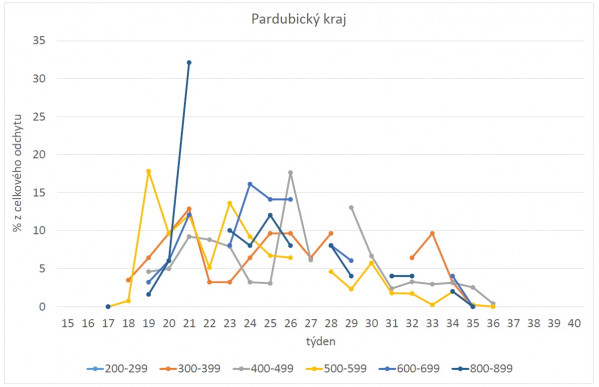 Pardubický kraj patří z hlediska vyhodnocování mezi atypické kraje. Sledováno zde bylo šest výškových intervalů. V některých výškových intervalech proběhlo první rojení od 18.–20. týdne, avšak v některých výškových intervalech se projevily zvýšené odchyty ve 22.–26. týdnu, což mohlo být opožděné první rojení, nebo sesterské přerojování. K druhému rojení ve výškovém intervalu 300–399 m n. m. došlo zřejmě v 33. týdnu. K ukončení sledování došlo v 36. týdnu, takže zde není podchycen potenciální začátek třetího rojení. Výše odchytů v tomto kraji byly velmi nízké, nejčastěji do stovky zachycených jedinců, částečně až do 300 ks, zcela výjimečně i výše, přičemž maximum bylo do 800 ks.