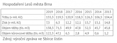 Lesům města Brna, které spravují neucelenou plochu 8300 hektarů, loni narostl zisk o více než milion korun na 7,5 milionu. Přesto, že porosty loni naplno zasáhla kůrovcová kalamita, zvýšily se i tržby, a to ze 120 milionů v roce 2018 na loňských 155 milionů. Městské firmě se podařilo vytěžené dříví dobře zobchodovat a byla také úspěšná v čerpání příspěvků na hospodaření v lesích, vyplývá z výroční zprávy zveřejněné ve Sbírce listin.