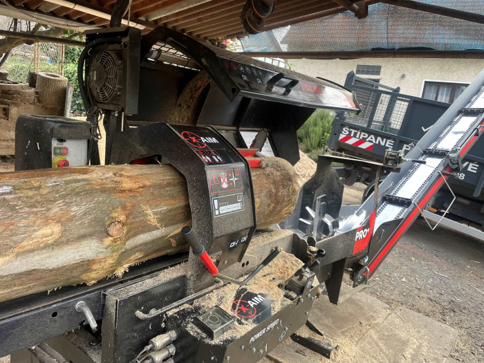 o 5 cm více než předchůdce. Má větší štípací tlak a celkově mu výkon dvou hydraulických čerpadel dodává obrovskou rychlost. Navíc na tomto stroji mám ještě funkci X-aim, kde si stroj hlídá průměr zpracovávaného dřeva a sám tak nastavuje štípací klín na střed špalku.