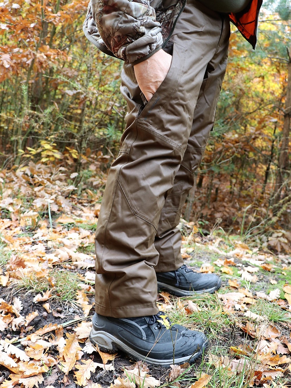 Kalhoty jsou pohodlné a díky fleecové podšívce je v nich opravdu teplo. Podšívka nedosahuje až ke koncům nohavic, ale končí přibližně 25 cm před nimi, což usnadňuje přetažení nohavic přes vyšší obuv. Nepromokavost jsme zkoušeli chůzí ve vyšší mokré trávě a můžeme potvrdit, že kalhoty jsou vůči vodě skutečně odolné. V postranních kapsách je možné mít náboje, zavírací nůž nebo doklady. Silná látka použitá na svrchní vrstvu kalhot při pohybu šustí, na což je nutné při lovu pamatovat.