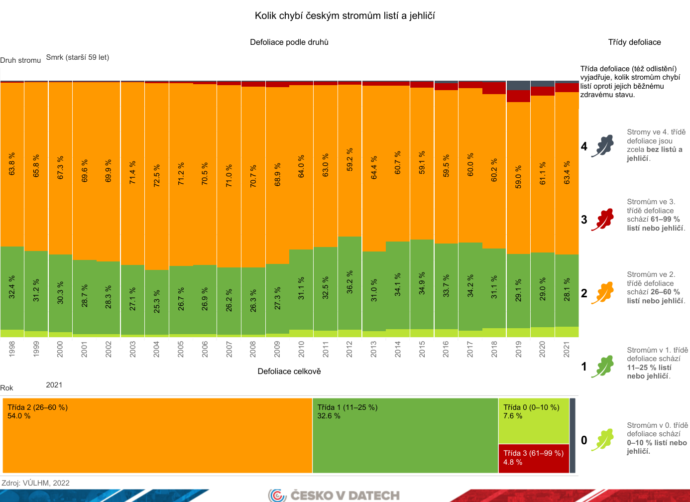 Tento trend lze pozorovat například u smrku – v českých lesích nejpočetněji zastoupené dřevině. Od roku 2009 se smrky starší 59 let pomalu zotavovaly a stoupal podíl stromů, které trpěly jen mírnou defoliací (postrádaly maximálně čtvrtinu jehličí).