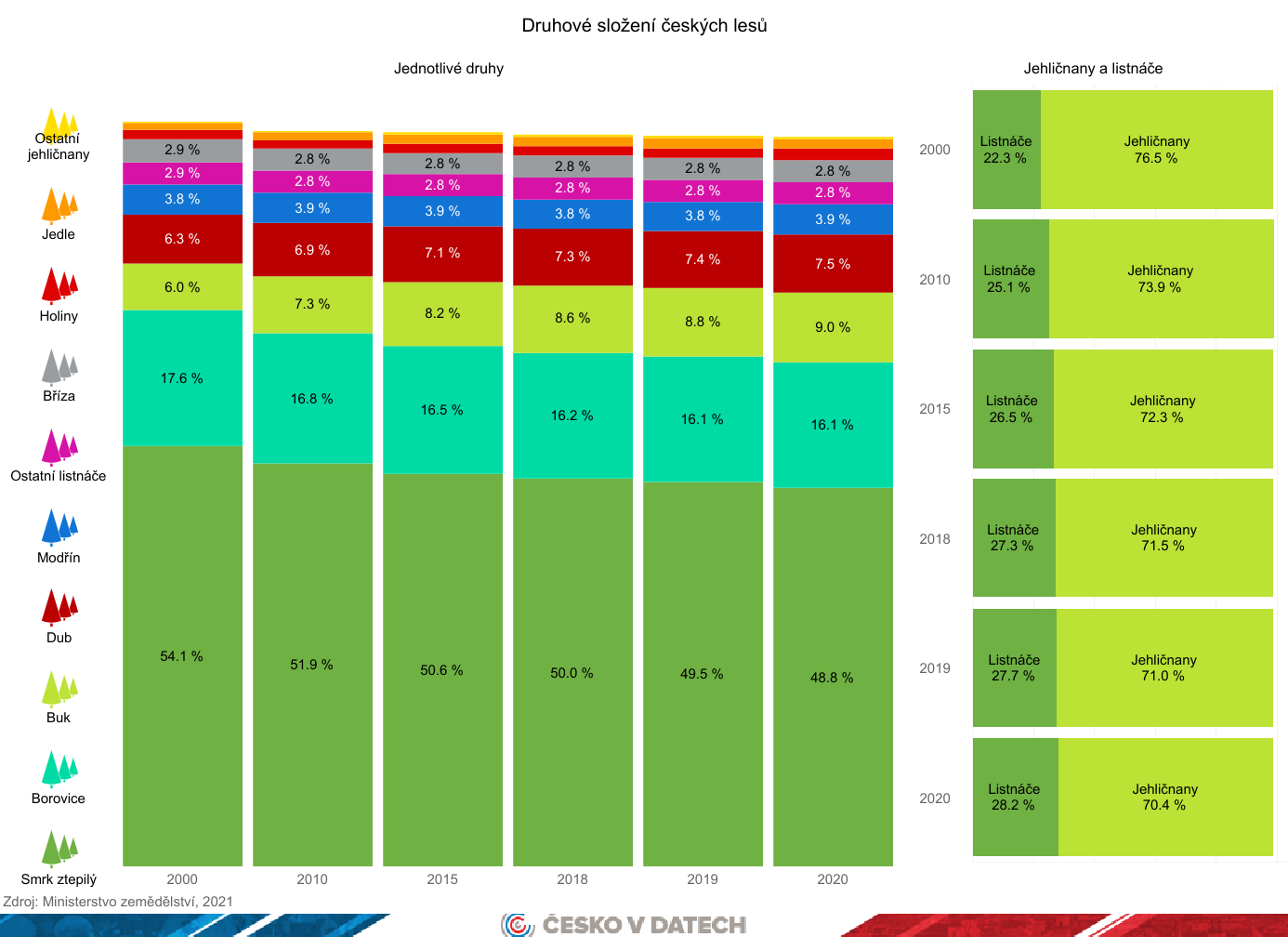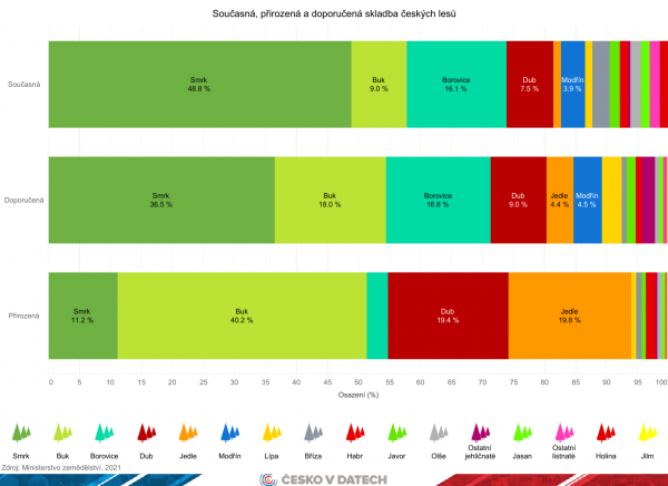 Jen smrky přitom tvoří polovinu veškerých stromů v českých lesích, borovice pak 16 %. Podle Ministerstva zemědělství by se ale v české krajině bez přičinění člověka smrk podílel na lesích jen 11 % a borovice 3 %.![]()