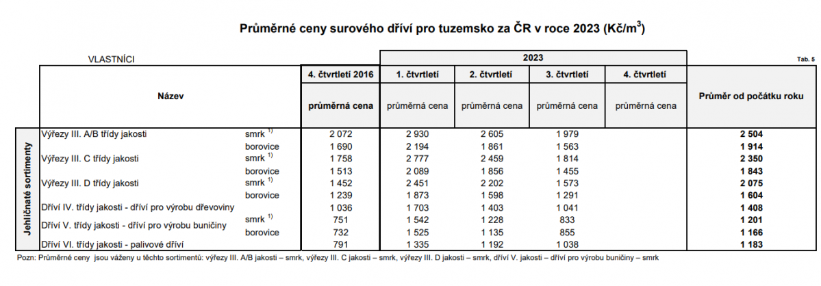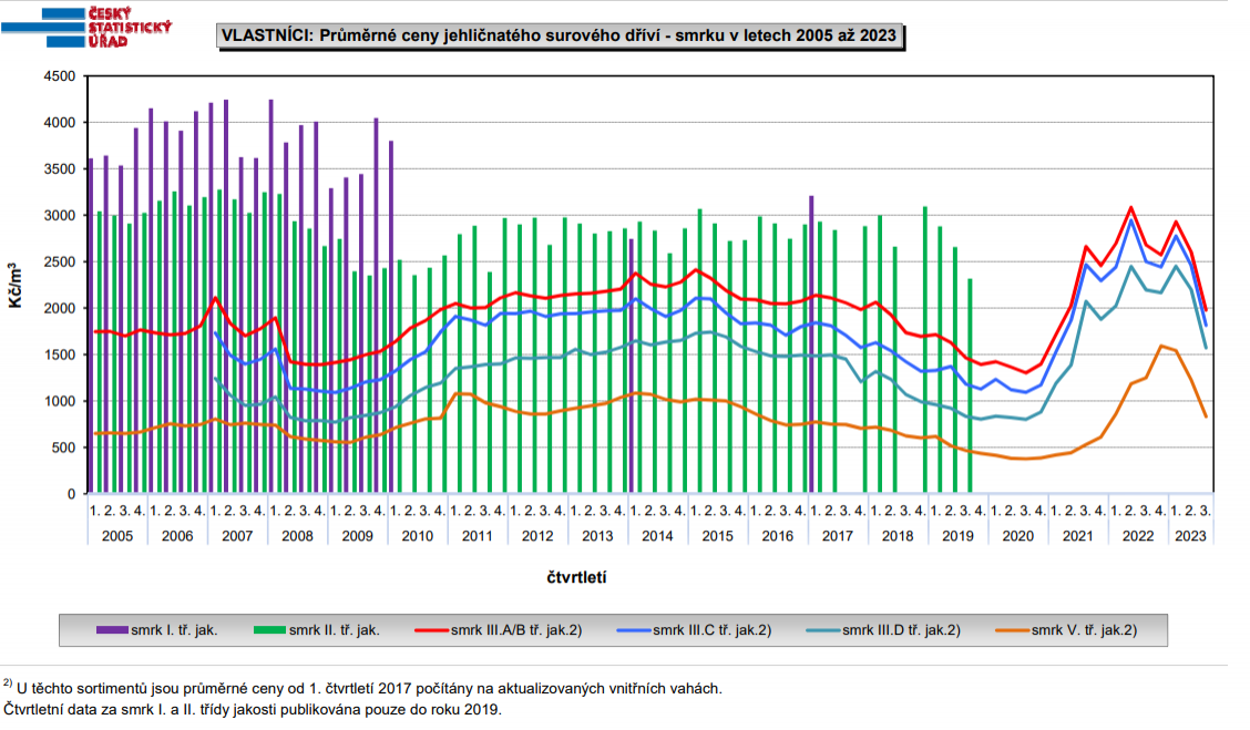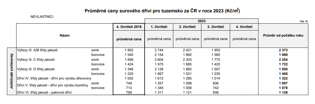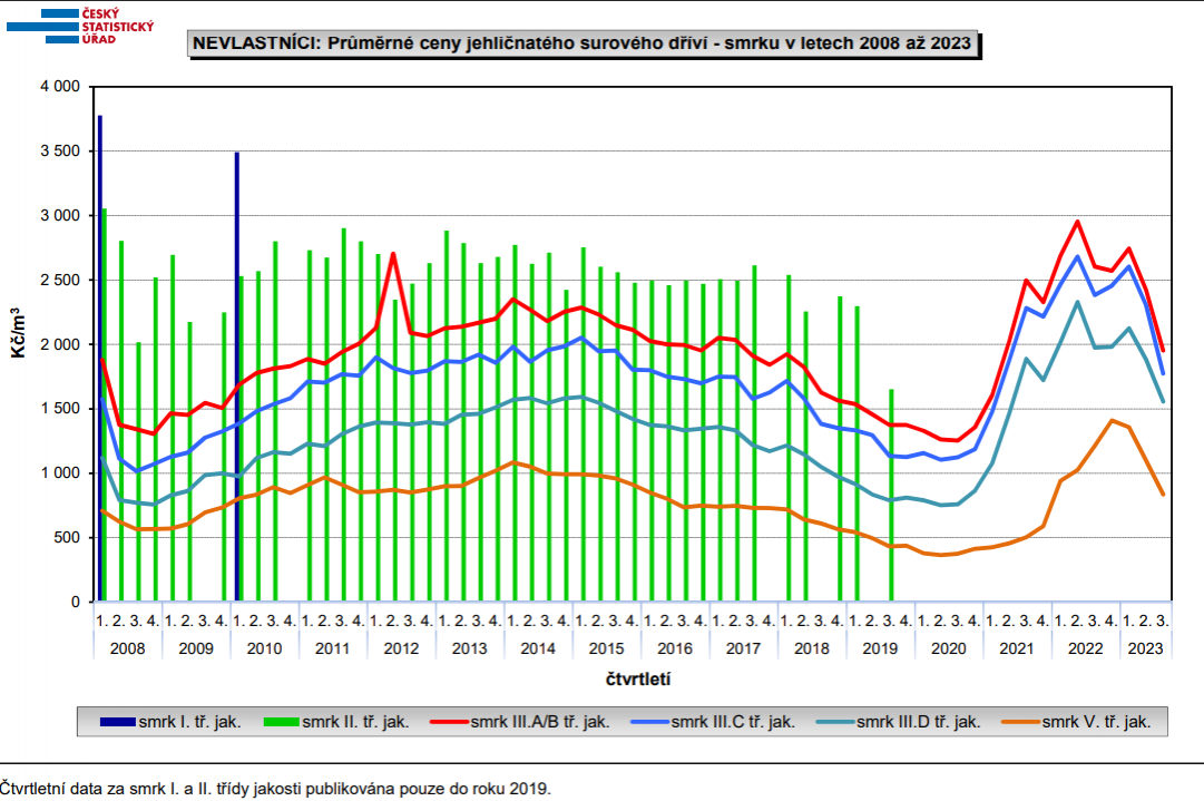 Český statistický úřad zveřejnil průměrné ceny dříví za třetí čtvrtletí 2023