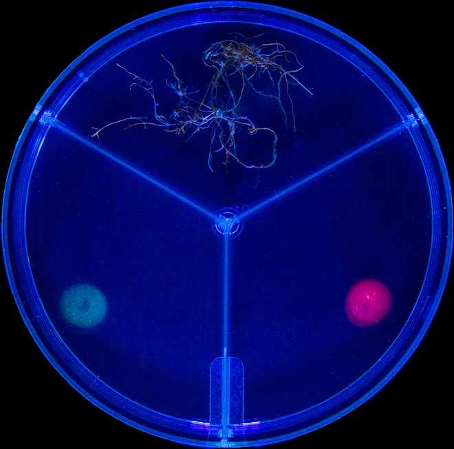 Pěstováním kořenů mrkve a hub v segmentovaných Petriho miskách, které obsahovaly nerovnoměrně rozložené zdroje živin, Kiers a její kolegové prokázali, že houby mohou přesouvat zdroje, aby získaly z rostlin vyšší prospěch. Foto: Victor Caldas