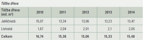 V lesích ČR bylo vytěženo celkem 15,48 mil. m3 surového dříví, což ve srovnání s předchozím rokem znamená nárůst o 0,15 mil. m3. Značnou měrou se na tomto objemu podílelo zpracování nahodilých těžeb (4,5 mil. m3). Podíl nahodilé těžby v roce 2014 činil 29 % a poněkud tak zhoršil podmínky pro plánovité hospodaření v lesích.