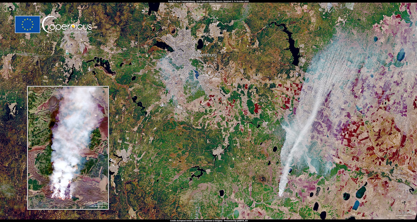 Požár rašeliny v Rusku, 22.10. 2011 Foto: European Union, Copernicus Sentinel-2 imagery