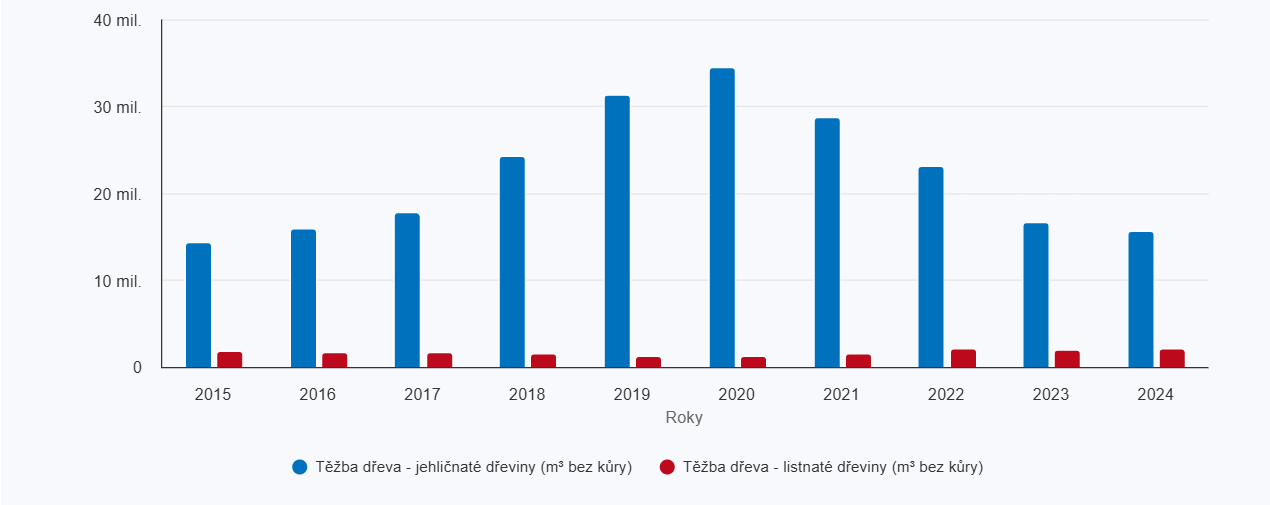 Celková těžba dříví v ČR v letech 2015-2024