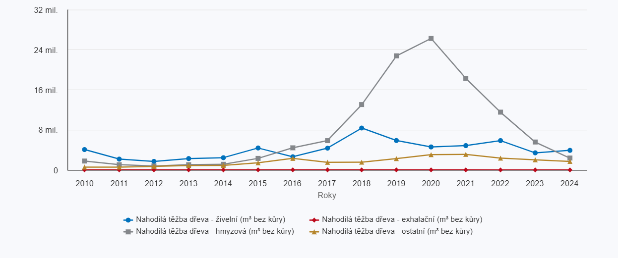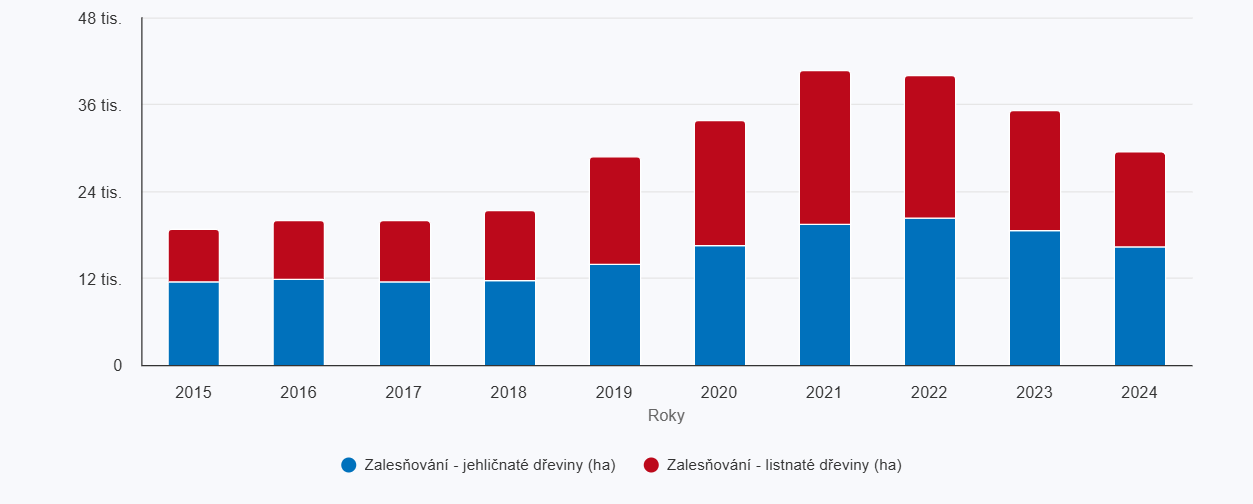 „V roce 2024 došlo ke snížení těžby dříví i plochy zalesňované sadbou a síjí. Přirozená obnova lesa se naopak realizovala na rekordní ploše přes 12 000 ha. Obnova lesů po kalamitách dále pokračovala," uvedl Josef Kahuda z oddělení statistiky zemědělství a lesnictví ČSÚ.