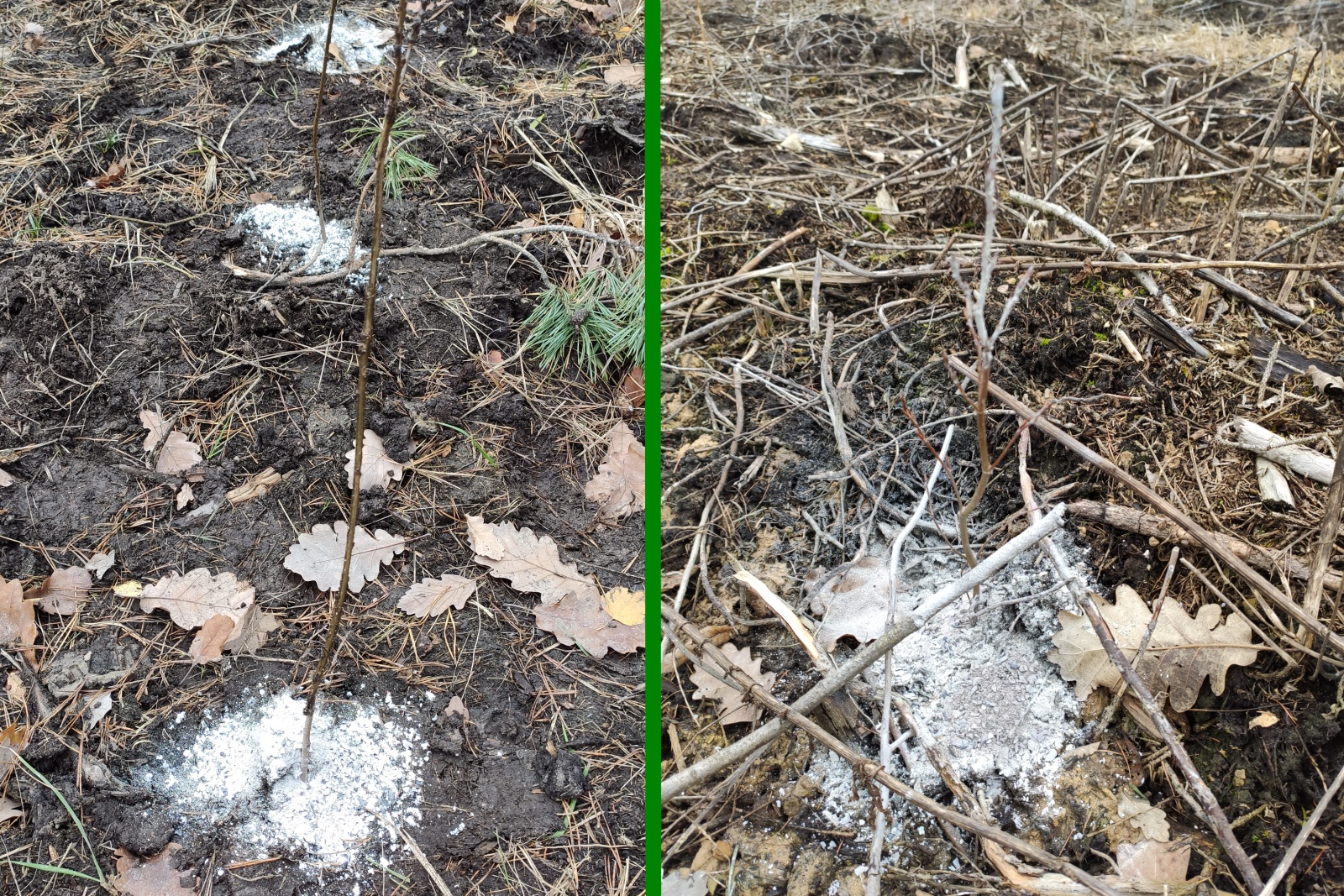 Aplikace 30 g přípravku na bázi karbidu vápníku na povrch půdy do oblasti kořenového krčku vysazených rostlin (experimentální plochy na lesních majetcích). Foto: archiv VÚLHM