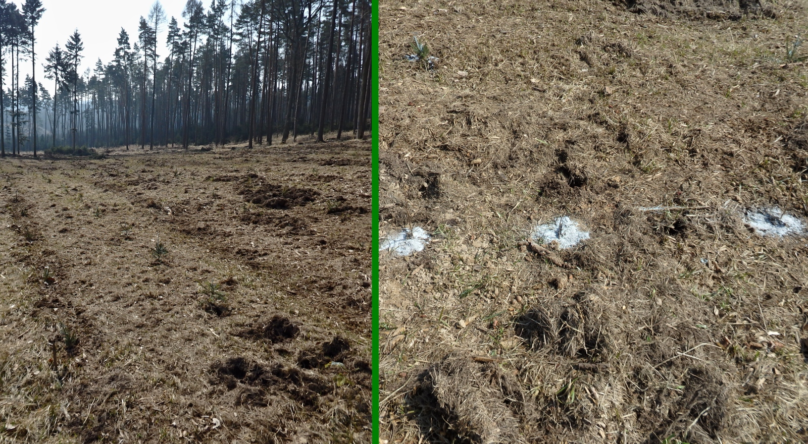 Paseka s podrceným klestem, kde je viditelné rytí od prasat, a výsadba ošetřená repelentem na stejné ploše. Foto: archiv VÚLHM
