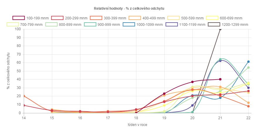 U l. severského, u kterého je registrováno méně odchytových míst, už bylo vysokých hodnot kumulovaného odchytu dosaženo ve značné části moravských okresů.