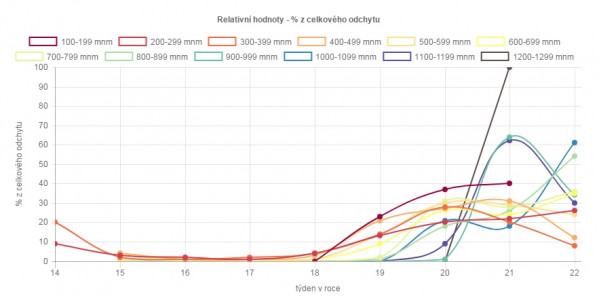 Podle vašich vkládaných odchytů je patrné, že rojení l. smrkového už probíhá v celé republice, na některých místech dokonce už dosáhlo vysoké míry kumulovaných odchytů (červená kolečka). Žloutnout (střední míra kumulovaného odchytu - žlutá kolečka) nám začínají například okresy na Šumavě a v kritické oblasti severovýchodní Moravy.