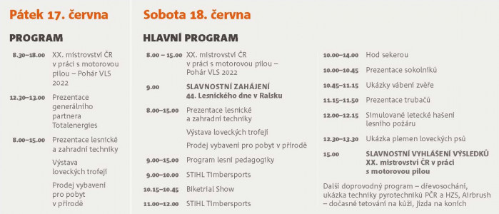 Již tradičním tahákem akce budou souboje nejlepších tuzemských i zahraničních dřevorubců v rámci národního šampionátu v práci s motorovou pilou. V rámci startovního pole se představí hned tři mistři světa i tuzemští šampioni. Barvy Vojenských lesů a statků ČR, pořadatele akce, budou ve startovním poli hájit především dva dřevorubci – dvojnásobný mistr republiky Jindřich Fazekaš z Ralska a vicemistr ČR Jaroslav Štelc z moravské lesnické divize státního podniku Plumlov.