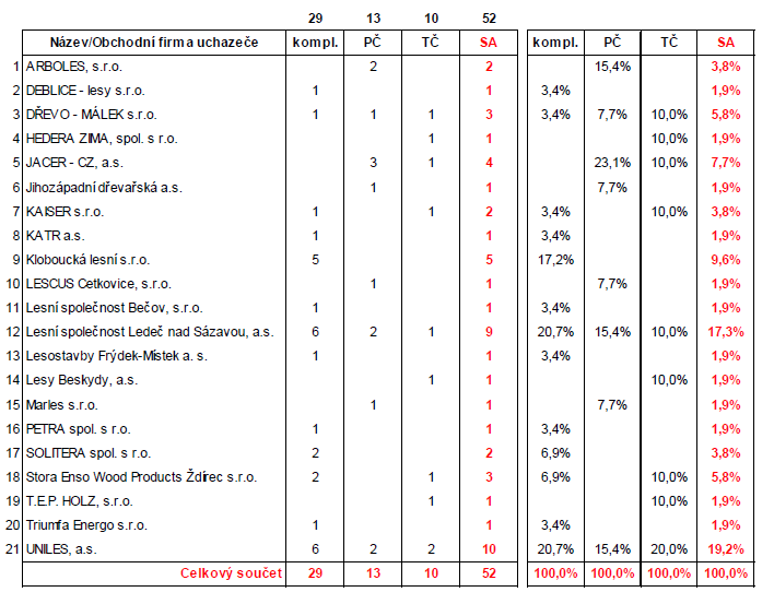 Po otevírání obálek je zřejmé, že nejvíce pro Lesy ČR nejvýhodnějších nabídek podaly společnosti UNILES (celkem 10 zakázek z 52), Lesní společnost Ledeč nad Sázavou (celkem 9 zakázek) a Kloboucká lesní (5 zakázek).